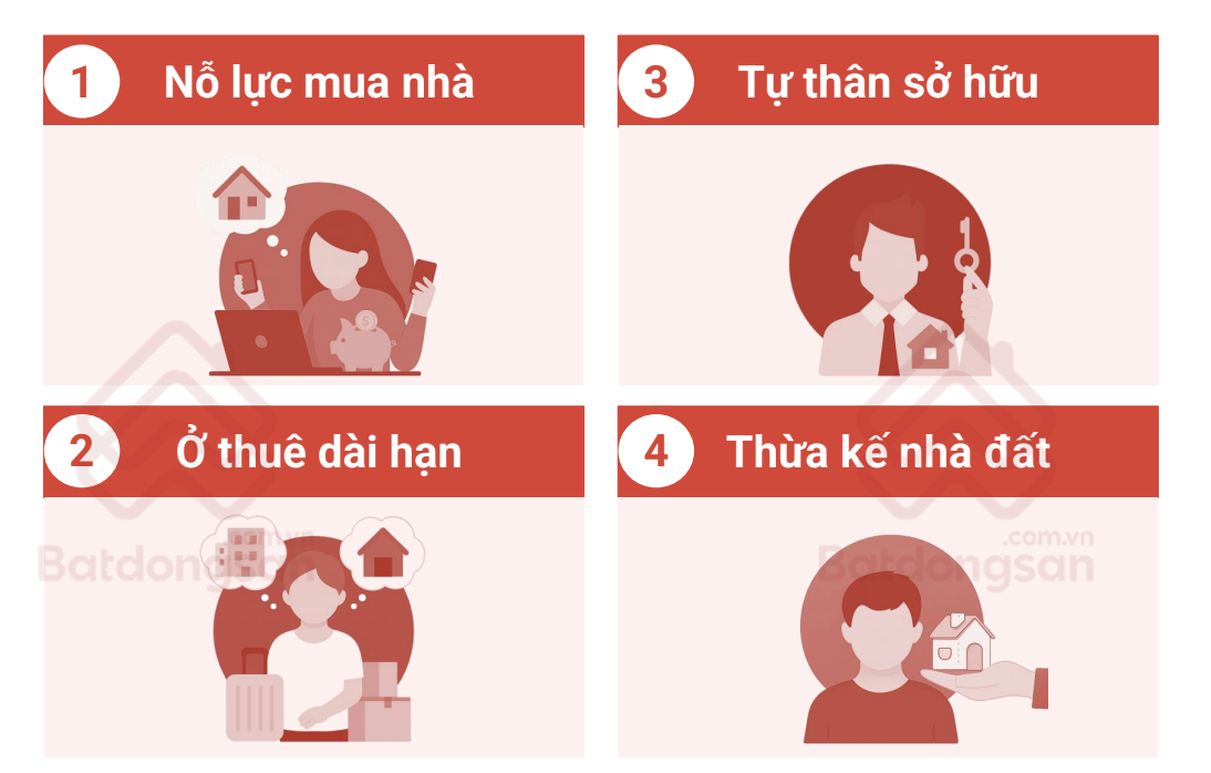 Sự xuất hiện của các bộ luật mới như Luật Đất đai, Luật Nhà ở và Luật Kinh doanh Bất động sản có hiệu lực sớm từ năm 2024 đã thiết lập một “luật chơi” minh bạch hơn, trực tiếp tác động đến tâm lý người mua.2 Niềm tin thị trường đang dần được củng cố khi các quy định về định giá đất theo thị trường và quyền lợi của người sở hữu nhà được làm rõ. Trong bối cảnh đó, người tiêu dùng Việt Nam không còn là một khối thống nhất; họ đã chia tách thành bốn chân dung điển hình với những đặc điểm nhân khẩu học, hành vi tài chính và hệ giá trị tâm lý riêng biệt: nhóm nỗ lực mua nhà, nhóm tự thân sở hữu, nhóm ở thuê dài hạn và nhóm thừa kế nhà đất.
